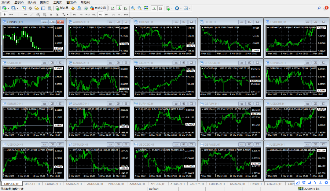 对于品种的选择,我没有过多的执念,并不纠结于某一个品种,哪一个有盈利机会就去交易哪一个品种,但是如何在众多的品种当中,及时发现有盈利机会的品种,实操起来并不容易,下图是20个图表同时打开的界面,几乎无法看清单个图表的行情走势,更不用说判断是否有交易机会了。这就是前面说的,越是看似简单的问题,想做好越是不容易。