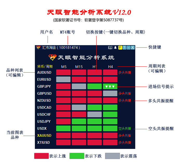 要解决上述问题,就需要借助程序的辅助,就比如我想同时监测11个品种,每个品种4个周期的行情走势,常规操作就需要同时打开44个图表,大家可以想象一下届时的场景,肯定是一个头两个大。通过程序,一个面板就搞定了,交易效率得到了几何倍的提升。(当然把这个程序写出来,又是一个难题,尤其对于我一个半路出家的程序员来说,更是难上加难,光写这一面板当时就用了足足3个月的时间)每个品种,每个周期的走势一目了然,红色代表上涨走势,绿色代表下跌走势,灰色代表震荡走势。