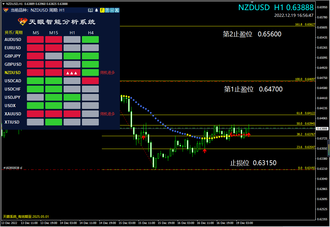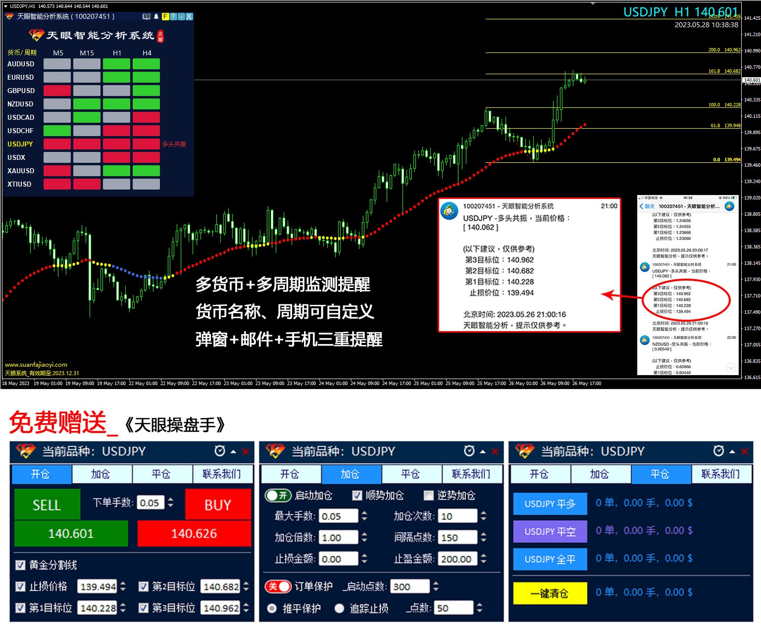通过上面的多货币多周期监测面板,在解决选择交易品种问题的同时,就解决了交易方向的问题,当然本着做大概率赚钱的交易的原则,我们选择3屏共振的方向进场,即M5-M5-H1三个周期的走势一致时,沿着趋势方向进场。